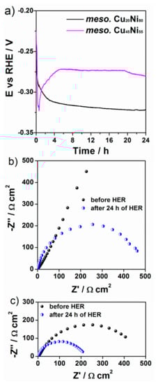 Potential as a function of time during galvanostatic HER at −10 mA·cm−2 for surface-mesostructured CuNi films (a). Nyquist plots before and after 24 h durability tests for surface-mesostructured films with composition (b) Cu20Ni80 and (c) Cu45Ni55.