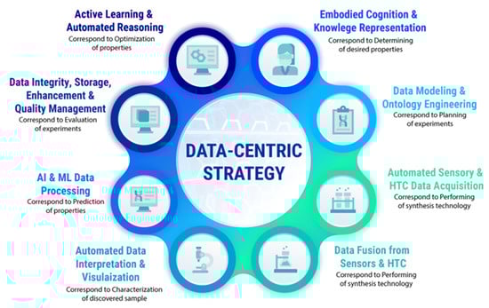 We think the circumstances above dictate the transformation from a human-centered research strategy to another that helps decision making based on the data, which is named a data-intensive nanomaterial discovery or data-centric strategy. The data-centric strategy stands more closely and effectively to AI and especially ML models and tools, but requires several changes in the experimentation processes at research laboratories, including considerable efforts on formalizing the embodied knowledge of experimenters on their own. We propose the following strategy (Figure 2) to transform the conventional research cycle in nanomaterial discovery to the data-centric research strategy, which facilitates the use of accelerators and SDL custom design.