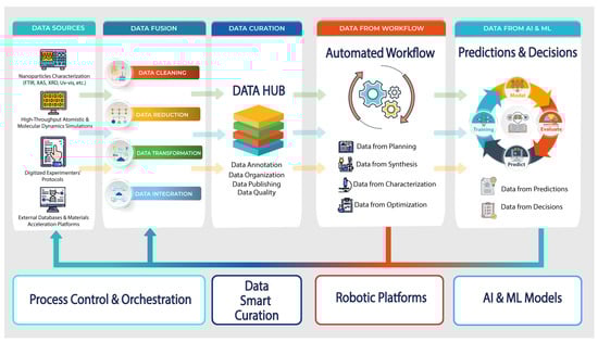The brief review given above demonstrates the vast diversity of nanoparticle and nanomaterial discovery and manufacturing approaches. Unfortunately, the tremendous efforts of chemists performing their routine experiments in laboratories do not always end in obtaining materials with desired properties. The conventional process of research and design of nanomaterials to industrial manufacturing [] and commercialization depends on many factors and can be estimated as a period of up to a decade. A review article [] discusses in detail the long path of graphene nanomaterials from laboratory experiments and research to industrial applications and markets. Thus, it is evident that the nanomaterial discovery process requires considerable effort, time, and expensive resources and needs to be accelerated by leveraging automation, robotics, AI technologies, and high-performance computing.