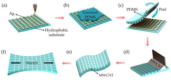 The MWCNT dispersion (XFWPM-H-M31) was purchased from XFNANO Materials Tech Co., Ltd., Nanjing, China, and dispersed in water. The concentration of the MWCNT was 14 wt.%. The length of the CNT was approximately 10 μm, and the outside diameter was greater than 50 nm. The PDMS prepolymer and cross-linker (Sylgard 184) were purchased from Dow Corning, Midland, MI, USA. Conductive silver ink (CON-EHD50) purchased from BroadTeko, Beijing, China. CON-EHD50 is a nano-silver conductive ink custom developed for electrohydraulic inkjet printing (EHD jetting, also known as near-field electrospinning).