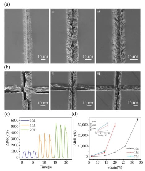 The mechanism of flexible strain sensor with embedded MWCNT network is mainly derived from crack propagation. Tensile strain changes the crack structure in the channel. The reconnection or disconnection of the crack structure fundamentally changes the conductivity of the strain sensor. Thus, the sensitivity of the sensor becomes larger with increasing ratio of PDMS prepolymer to cross-linker. The relative resistance changes of sensors prepared with different proportions of PDMS prepolymer and cross-linking agent under a tensile strain of 14% are shown in Figure 2c. The normalized resistance (ΔR/R0) is defined as the ratio between the resistance change (ΔR) to the initial resistance (R0), where ΔR = R − R0.