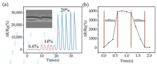 Sensor performance at PDMS ratio of 15:1. (a) Normalized resistance of the strain sensor at 6.6%, 14%, and 20% strain. The inset shows the SEM of crack extension after stretching MWCNT (b) Response/recovery time of the sensor at a strain of 14%.