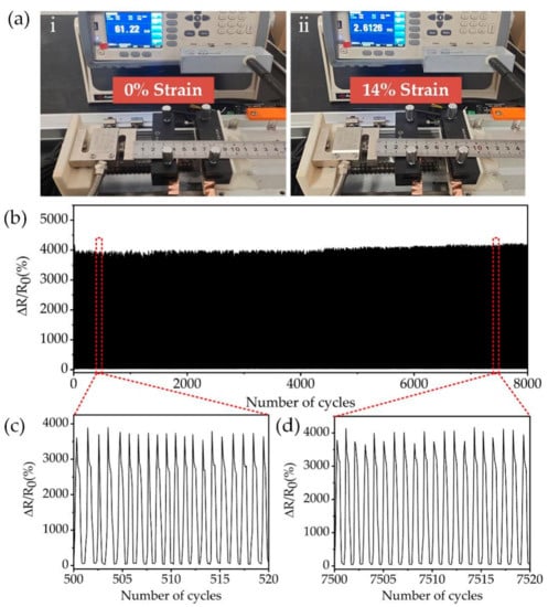 The mechanical stability of strain sensors is another important parameter for evaluating the performance of strain sensors. In practical applications, the sensor needs to undergo thousands of stretch-release processes to maintain almost constant resistance. The mechanical stability of the flexible strain sensor with the embedded MWCNT network was investigated using a homemade tensile test platform. The stretch-release process of the sensor is shown in the Figure 5a. The sensor is fixed on a tensile tester, and the resistance change of the sensor in the range of 0–14% of tensile strain is measured using a resistance tester, and the measured data is transmitted to the PC for processing. Figure 5a(i,ii) shows the resistance values of the sensor measured at 0% and 14% of the tensile strain, respectively. Figure 5b shows the relative resistance changes of the sensor under stretch-release cycles. The sensing stability was tested continuously for 8000 stretch-release cycles at 14% strain. The ΔR/R0 always varies from 0% to 4200%, while the resistance always returns to the initial state after release. Figure 5c,d shows the ΔR/R0 changes during 500–520 and 7500–7520 stretch-release cycles. After 8000 cycles, the ΔR/R0 only has a small increase, and the sensor remains stable. The channel structure of the sensor provides good interfacial stability for MWCNT crack stretching. Since the MWCNT is deposited inside the PDMS channel and forms a three-sided contact with PDMS, compared with other 2D MWCNT deposited on the substrate surface, the MWCNT in this paper forms a 3D structure, which ensures good interfacial contact. Meanwhile, the crack is fully extended and no generated new cracks after a certain tensile strain allowing the sensor resistance change to be stable in the 0–4200% interval.