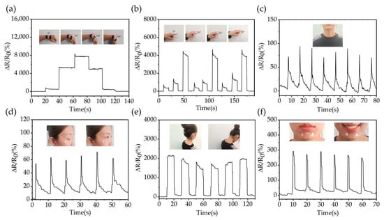 To evaluate the possibility of sensor applications in wearable devices, tests were conducted on finger or wrist flexion, swallowing movements, changes in eye movements and facial expressions, and changes in neck flexion (Figure 6). To isolate the human body resistance from the measurement results, medical tape or insulating tape was used to adhere the strain transducer to the human skin surface. When the sensor is attached to the wrist and finger (Figure 6a,b), it can clearly detect the changes in resistance when the wrist and finger are bent. The sensor identifies different resistance changes; the normalized resistance value of the wrist reaches 8000% and that of the finger is 4000%. Meanwhile, subtle human motion such as swallowing and eye movements can also be promptly and accurately monitored by the strain sensor (Figure 6c,d). The ΔR/R0 responses reached 70% or more with human swallowing.
