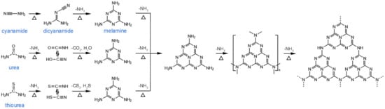 - Zhang, G.; Zhang, J.; Zhang, M.; Wang, X. Polycondensation of thiourea into carbon nitride semiconductors as visible light photocatalysts. J. Mater. Chem. 2012, 22, 8083–8091. [Google Scholar] [CrossRef]