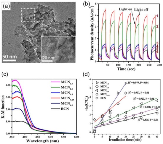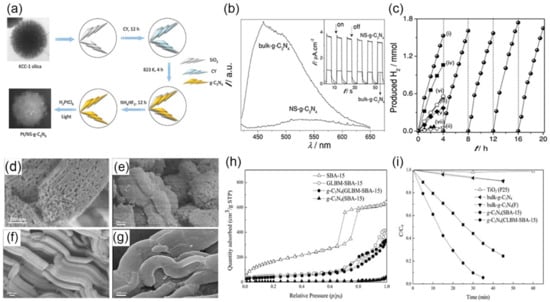 - Liu, Y.; Shen, S.; Li, Z.; Ma, D.; Xu, G.; Fang, B. Mesoporous g-C3N4 Nanosheets with Improved Photocatalytic Performance for Hydrogen Evolution. Mater. Charact. 2021, 174, 111031. [Google Scholar] [CrossRef]