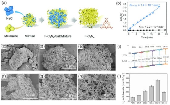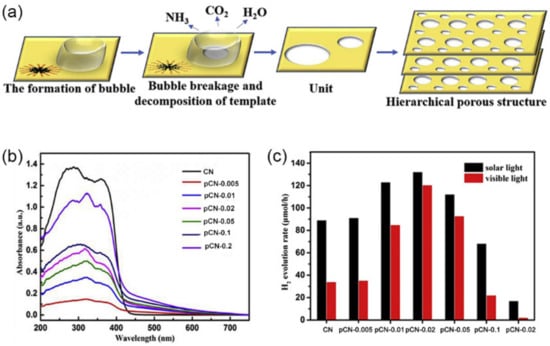 - Wu, X.; Ma, H.; Zhong, W.; Fan, J.; Yu, H. Porous Crystalline g-C3N4: Bifunctional NaHCO3 Template-Mediated Synthesis and Improved Photocatalytic H2 Evolution Rate. Appl. Catal. B Environ. 2020, 271, 118899. [Google Scholar] [CrossRef]