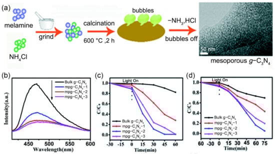 - Zhang, S.; Hu, C.; Ji, H.; Zhang, L.; Li, F. Facile Synthesis of Nitrogen-Deficient Mesoporous Graphitic Carbon Nitride for Highly Efficient Photocatalytic Performance. Appl. Surf. Sci. 2019, 478, 304–312. [Google Scholar] [CrossRef]