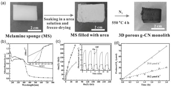 - Liang, Q.; Li, Z.; Yu, X.; Huang, Z.-H.; Kang, F.; Yang, Q.-H. Macroscopic 3D Porous Graphitic Carbon Nitride Monolith for Enhanced Photocatalytic Hydrogen Evolution. Adv. Mater. 2015, 27, 4634–4639. [Google Scholar] [CrossRef]