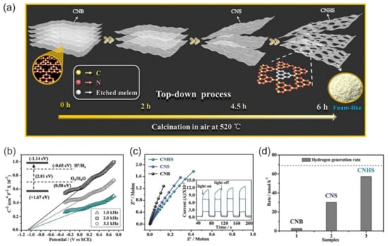 - Wen, J.; Xie, J.; Yang, Z.; Shen, R.; Li, H.; Luo, X.; Chen, X.; Li, X. Fabricating the Robust g-C3N4 Nanosheets/Carbons/NiS Multiple Heterojunctions for Enhanced Photocatalytic H2 Generation: An Insight into the Trifunctional Roles of Nanocarbons. ACS Sustain. Chem. Eng. 2017, 5, 2224–2236. [Google Scholar] [CrossRef]