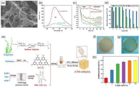 - Zhao, J.; Li, B.; Liu, Z.; Dai, D.; Li, Y.; Shi, R.; Zhang, H. A Novel Solar-Triggered MIL-125(Ti)/g-C3N4/SA Composite Aerogel with High Catalytic Activity for Degradation of Organic Contaminants. Sep. Purif. Technol. 2021, 279, 119696. [Google Scholar] [CrossRef]