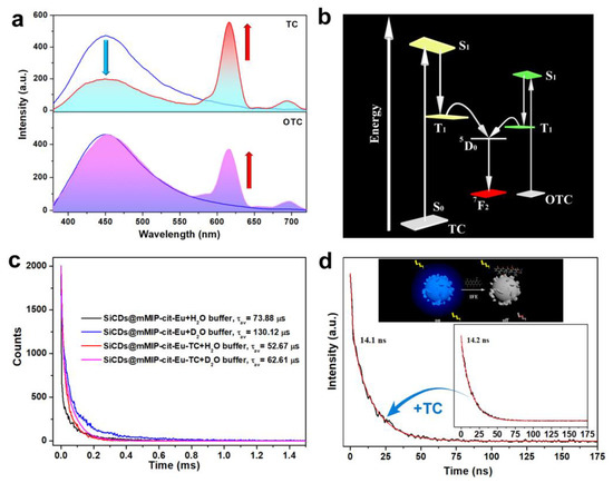 The detection process and sensing mechanism of SiCDs@mMIP-cit-Eu were illustrated in Figure 4. At first, SiCDs@mMIP-cit-Eu nanoprobe can emit strong blue fluorescence at 450 nm of SiCDs and weak red luminescence of Eu3+ (dominated at 616 nm). After adding a certain concentration of TC or OTC, the fluorescence intensity of Eu3+ increased, and the characteristic emission bands of Eu3+ at 591, 616, and 697 nm were obvious (Figure 4a). The fluorescence enhancement mechanism can be attributed to two reasons. Firstly, the β-diketone configuration of both TC and OTC can strongly chelate with Eu3+ ions through metal–ligand interaction and effectively transfer energy to Eu3+ ions via “antenna effect”, and the energy transfer process usually began with the lowest triplet (T1) of the ligand donor and followed the Dexter exchange principle. As shown in Figure 4b, the T1 state of TC and OTC were 19,500 and 19,160 cm−1 [48], which were suitable for the energy transfer from the ligand to the central Eu3+ ions (5D0 level, 17,300 cm−1), thus sensitizing the fluorescence of Eu3+ ions. Secondly, the coordinated water molecule occupied the first coordination layer in the binary complex (cit-Eu), due to the coordination of the central metal Eu ion was unsaturated. The strong chelation of TC and OTC with Eu3+ ions can replace the coordinated water molecules and reduce the vibronic coupling with O-H oscillator from water molecules, resulting in the enhancement of Eu(III) emission. This statement can be verified by measuring the number of coordinated water molecules in the absence and presence of TC and OTC. The numbers of coordinated water molecules (nw) in SiCDs@mMIP-cit-Eu, SiCDs@mMIP-cit-Eu-TC, and SiCDs@mMIP-cit-Eu-OTC can be determined according to the equation developed by Horrocks and Supkowski [49]: