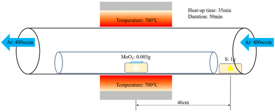 Before the start of the experiment, the cleanliness of the substrate was confirmed (Supplementary Materials Section 2). First, 1 g of sulfur and 0.003 g of MoO3 were prepared and placed in appropriate positions in the inner tube of the quartz tube. The substrate was set inverted on molybdenum trioxide (MoO3). The inert gas used during growth was Ar. Initially, 500 sccm of Ar was let in for 10 min to clean the internal cavity. More water and oxygen were removed in the quartz tube, after which, the Ar flow was reduced to 200 sccm. The heating rate was set to 20 °C/min. The maximum temperature was set to 700 °C, and the heating time was set to 35 min. After reaching the maximum temperature, the same was maintained for 50 min. Finally, once the temperature dropped to <400 °C, it was further dropped to room temperature by opening the lid, and the MoS2 structure was obtained. The experimental process is shown in Figure 1.