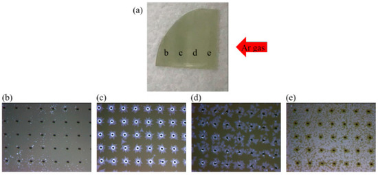 Figure 3a is an image of the substrate after actual growth. The red arrow indicates the direction of Ar flow during CVD. The growth distributions of different MoS2 shapes are shown as the marked locations b, c, d, and e. Figure 3b is the OM image at position b in Figure 3a, where the black holes are the result of the original laser processing, and the blue points are the areas where MoS2 grows. Figure 3c is the OM image at position c in Figure 3a, where MoS2 grows regularly in the hole area, with a bright blue ring pattern on the edge of the hole. This finding shows the existence of a multilayer MoS2. The light blue irregular shape distribution on the periphery of the hole is represented by the existence of single-layer MoS2. Figure 3d is the OM image at position d in Figure 3a, where we can see that a single layer of MoS2 grows along the hole periphery. The periodic growth is not as good as that at the c position, but the single-layer MoS2 covers a large area with no high-level MoS2. Figure 3e is the OM image at position e in Figure 3a, where we can see that the single layer of MoS2 grows in a more broken manner on the substrate and covers a larger area, but no MoS2 exists around the hole. These results show that according to the Ar flow direction, MoS2 grows in the order of large to small coverage area and from a broken and to a more regular growth around the hole until it no longer exists. Thus, we infer that the MoS2 growth is cyclical.