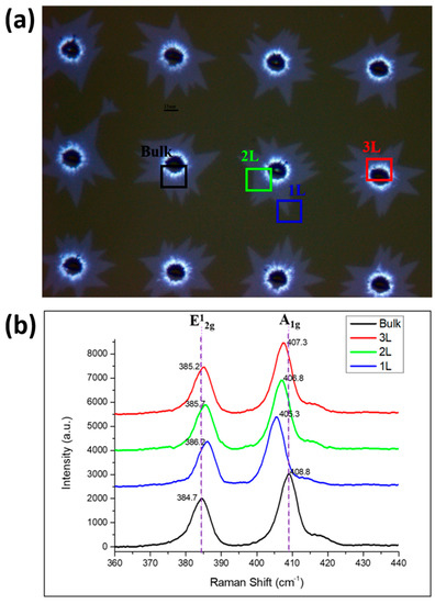Figure 4a shows an OM image of MoS2 periodic growth. The black, blue, green, and red boxes indicate the areas where multilayer and one-, two-, and three-layer MoS2 growth are measured, respectively. Figure 4b shows the Raman measurement diagram of each area marked in Figure 5a. The black part demonstrates that the Raman shift is between 384.7 and 408.8 cm−1, and the value of the peak difference (Δk) is 24.1 cm−1. This finding indicates more than four layers, which is unsuitable for semiconductor components and optoelectronic components. The blue part shows that the peak difference between the Raman shift of 386.2 and 405.3 cm−1 is 19.1 cm−1, which represents a single layer. In the green part, we find that the peak difference between the Raman shift of 385.7 and 406.8 cm−1 is 21.1 cm−1, defined as a two-layer growth of MoS2. In the red part, we find that the peak difference between the Raman shift of 385.2 and 407.3 cm−1 is 22.1 cm−1, defined as three layers of MoS2. The Raman measurements prove that the periodicity of our growth has one- to three-layer and multilayer characteristics. These findings prove that MoS2, which grows periodically in the hole, has different distributions from single to multiple layers and, thus, has multiple potential applications. The areas of few-layered MoS2 are sufficiently large. Thus, it is highly applicable in semiconductor device manufacturing.