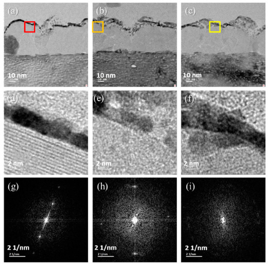 Panels (a–c) represent the TEM images of Sample 2 in sampling locations A, B, and C, respectively; (d–f) represent the HRTEM images of the red, orange, and yellow boxes in (a–c), respectively; and (g–i) represent the SAED diagram in (d–f), respectively.
