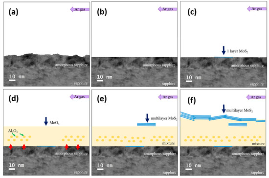 Figure 9 is a schematic of the growth process of MoS2, and Figure 9a is a schematic before growth. The upper layer of the lower sapphire substrate is an amorphous state damaged by laser processing. In Figure 9b, the blue arrow indicates the single layer of MoS2 grown on the substrate surface at the initial stage of growth. In Figure 9c, the blue arrow indicates the coverage of MoO3 at the middle stage of growth, and the green arrow indicates the Al2O3 surface layer at the same time, showing that it mixed at a high temperature to form a mixture zone. The blue arrow in Figure 9d indicates the formation of multiple layers of MoS2, indicating that S gas is greater than MoO3 gas during this growth period. Figure 9e is the schematic of the growth end, and the blue arrow indicates that multiple layers of MoS2 grow to be stacked in sheets. Although in this study, MoS2 is grown on a laser-processed periodic-hole sapphire substrate through CVD, to integrate the developed MoS2 films into practical tools and nanostructures, various patterning and interfacing approaches have been developed. Post-patterning approaches have been successful, indicating wide-ranging applications in current microelectronic techniques, such as FIB milling, photo- and electron-beam lithography, and combinations of metal sputtering processes with selective etching after photolithographically defined masking [51,52,53,54].
