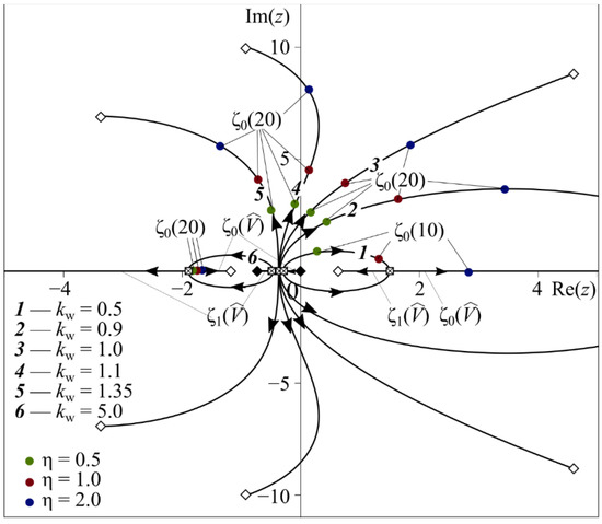 Locating zeros of Equation (47) , , their movements in the complex plane depending on the change in the dimensionless parameters of the problem is the main goal of solving Equation (47).