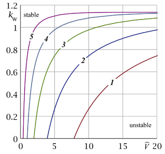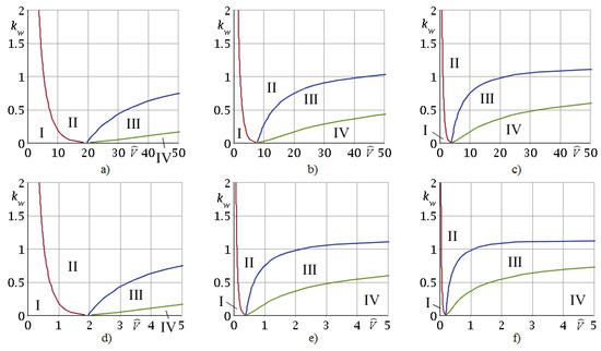 Figure 3 presents domains of stability (I, II) and instability (III, IV) in plane (, ) and boundaries between them for = 100 and different values of = 0.1; 0.25; 0.5; 1.0; 5.0; 10.0. These plots show that, at fixed , , the parameter affects the position of the boundaries of stability and instability. The point of intersection of boundaries I–IV, lying on axis (Figure 3), shifts depending on and has a coordinate (). At this result coincides with [41]. The formula for shows the effect of the parameter (Figure 3) on the boundaries of domains I–IV.