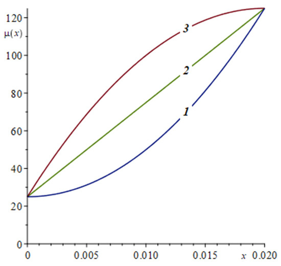 where , , . This means that the shear modulus is equal to at the coating–substrate interface (), to at the contact interface (), and to in the middle of the coating. If then and the law (64) becomes linear.