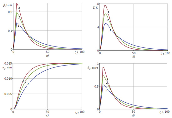Let us study the effect of the parameter of the considered thermoelastic problem on wear by a hard abrasive (half-plane I) of an elastic strip made from aluminum with a graded content of alumina (Al2O3) on the main characteristics of the contact: temperature from (57), contact stresses from (59), coating wear from (62) and wear rate . This FGM strip is characterized by an increased shear modulus = 125.0 GPa at the contact and shear modulus at the interface with the substrate = 25.0 GPa, = 0.34, = 88.1 × 10−6 mm2/s, = 22.9 × 10−6 1/K, = 209.3 Bt/(m·K), f = 0.47, = 20 mm, = 5 mm, = 5 s, V = 2.5 mm/s, . We consider three different values , which, together with their corresponding values , are presented in Table 1.