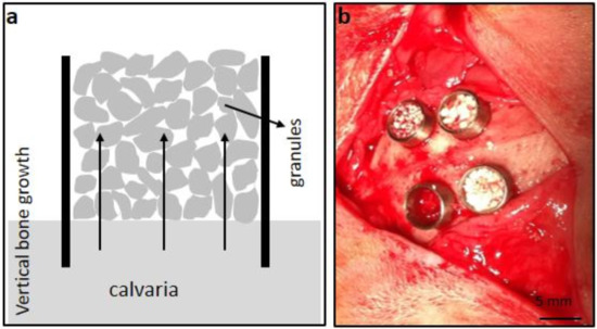 Vertical bone augmentation in rabbit calvaria is an established model for evaluating bone regeneration materials. The calvarial bone is ideal for vertical bone augmentation because of its embryological, morphological, and physiological similarities with the oral and maxillofacial region [49,50,51]. Besides, it has a large flat surface, facilitating the fixation of titanium rings [52].