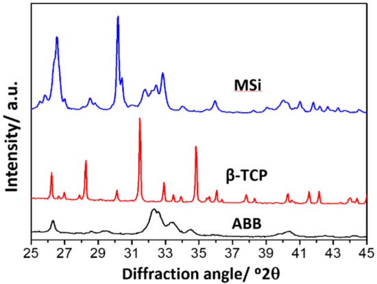 ABB is obtained by protein extraction from bovine bone, and the β-TCP is a synthetic material produced by sintering. On the other hand, MSi is synthesized by a low-temperature process involving a hydraulic cementation reaction as previously described [25,26,27].