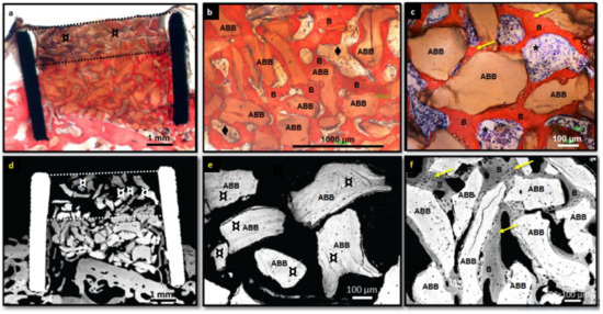 Histological (a–c) and BS-SEM images (d–f) of rings implanted with ABB granules. Rings remained almost full to the top of the cylinder (upper dotted line) with notable remaining granules of ABB (a,d). Non-osteointegrated granules were surrounded by connective tissue at the upper part of the cylinder (a,d,e). Vertical bone growth achieved the middle of the cylinder height (lower dotted line) (a,d). A very well osteointegrated particles surrounded by new bone were observed in all images, except e, which showed non-osteointegrated material present at the upper part of the cylinder. No changes in particle morphology after implantation were observed (b,c,e,f). Mature osteocytes were present at the newly formed bone (c,f). (Legend: B: newly formed bone; ¤: non-osteointegrated granules; *: hematopoietic bone marrow; ⧫: adipose bone marrow; yellow arrows: osteocytes lacunae).