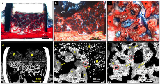 Histological (a–c) and BS-BSE images (d–f) of rings implanted with β-TCP granules. After implantation, 20% of the cylinder was empty (upper dotted line) (a). A high amount of remaining β -TCP was not osteointegrated (b,d,e) and vertical bone growth achieved only the middle of the cylinder height (lower dotted line) (a,d). Non-osteointegrated granulates were surrounded by connective tissue at the upper cylinder part (b). New trabecular formed bone showed homogeneous material osteointegration (b,c,e,f). Trabecular bone maturation was evident, with regular mineralized osteocytes lacunae and some vascular channels (e,f). Hematopoietic bone marrow was present (c). Legend: B: newly formed bone; ¤: non-osteointegrated material; *: hematopoietic bone marrow; yellow arrow: osteocytes lacunae; red circle: vascular channels; CT: connective tissue; TCP: β-TCP material.