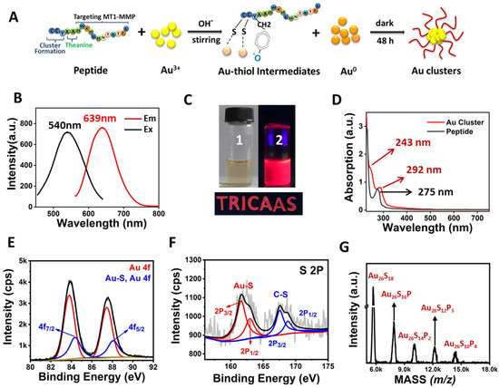 The preparation method of Au clusters was similar to the method we previously reported [39,40]. The peptide (H2N-CCY-XX-HWKHLHNTKTFL-COOH) contains three domains. Domain 1 was CCY, the sulfhydryl of cysteine (C) and phenolic groups of tyrosine (Y) could capture the Au cluster via the Au–S bond. Domain 2 (XX) was two theanine, which was a functional secondary metabolite in tea plants, to enhance the biocompatibility and separate the Domain 1 and Domain 2 of peptide. Domain 3 was the sequence (HWKHLHNTKTFL) for binding to MT1-MMP protein [41]. A schematic diagram of the construction of Au clusters is depicted in Figure 1A.