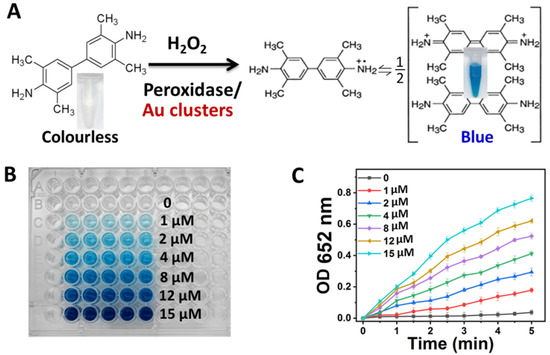 The catalytic ability of Au clusters was detected by oxidizing TMB in the presence of H2O2. In the catalysis of horseradish peroxidase, the colorless TMB can become a blue water-dissolved product. This product has a maximum absorption peak at 652 nm. The catalytic ability of Au clusters was tested by mixing H2O2, TMB and Au clusters. This mixed solution system contained 100 mM H2O2, 1 mM TMB and different concentrations of Au clusters (0, 1, 2, 4, 8, 12, and 15 µM). These catalytic reactions were performed in a 96-well plate. Finally, the absorption values (λ652nm) at different reaction time points were monitored by a microplate reader (SpectraMax M2).