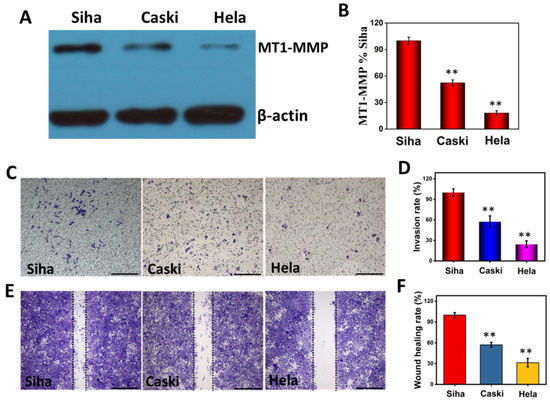 (A,B) The expression level and analysis of MT1-MMP in Siha, Caski and Hela cells. (C,D) Photo images and analysis of invasion ability of Siha, Caski and Hela cells after 24 h incubation. (E,F) Photo images and analysis of migration ability of Siha, Caski and Hela cells after 24 h incubation. Scale bars, 200 μm. ** p < 0.01.