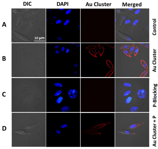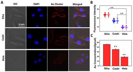 Briefly, after being fixed with 3.7% paraformaldehyde for 30 min, Siha cells were washed with PBS three times. Then, cells were treated with 8 µM Au clusters for 0.5 h at 37 °C. The Siha cells in the control group were treated with PBS. The cell nuclei were stained with DAPI (5 µg/mL, 5 min). Finally, the Siha cells were imaged by UltraVIEW Vox (PerkinElmer, Waltham, MA, USA) CLSM attachment and a Nikon Ti-e microscope with a 60 × 1.4 numerical aperture plan apochromatic oil immersion lens.