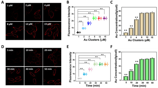 Optimization of labeling conditions of Au26 cluster for MT1-MMP. (A) Fluorescence imaging of Siha cells treated with different concentrations of Au clusters for 30 min. (D) Fluorescence imaging of Siha cells treated with 8 μM Au clusters at different times. (B,E) Fluorescence intensity analysis corresponds to A and D. Each point represents the fluorescence intensity of a cell. (C,F) The average amount of Au determined by ICP-MS on Siha cells corresponding to A and D. ** p < 0.01.