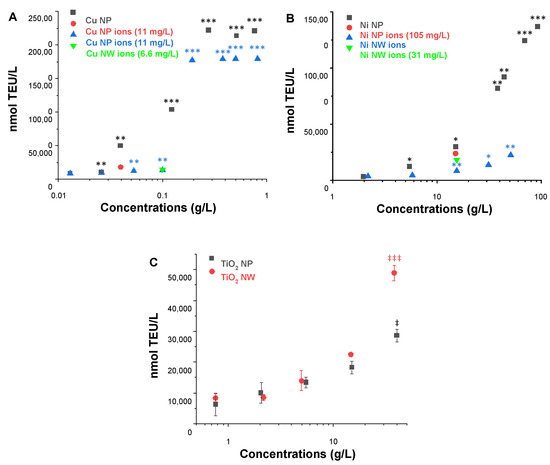 FRAS testing (A) Cu NP, Cu NP ions, Cu NW and Cu NW ions (B) Ni NP, Ni NP ions, Ni NW and Ni NW ions (C) TiO2 NP and TiO2 NW. Error bars indicate one standard deviation from triplicate testing, and are smaller than the size of the symbol in most cases. Statistics were performed using either ANOVA-Dunnett’s T3 (* p ≤ 0.05, ** p ≤ 0.01, *** p ≤ 0.001) or the 2-sided Dunnett’s test (‡ p ≤ 0.05, ‡‡‡ p ≤ 0.001).