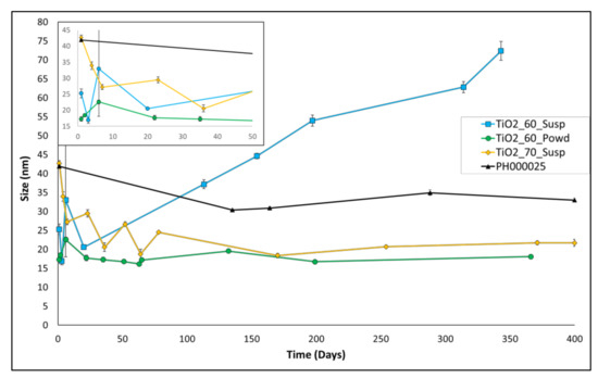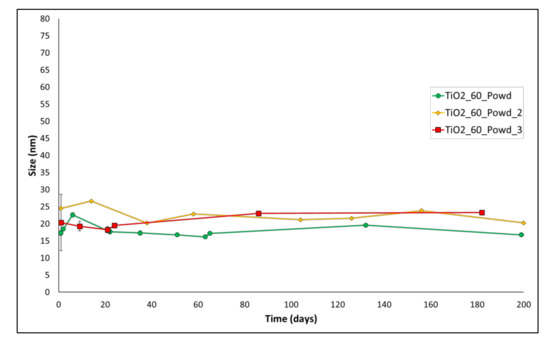 Here, the stability of all three suspensions is good but with different trends. Particularly, TiO2_60_susp shows an initial small size value; however, the average size of the nanoparticles in this batch starts increasing slowly but continuously by the 20th aging day onward. TiO2_70_susp, conversely, shows the largest size at the beginning of the aging, displaying then a slow but constant decrease in size (despite some oscillations) and reaching a stable size of 20 nm from the 170th day onward. The most stable suspension is TiO2_60_Powd, with an average size value of 21.67 nm at the beginning and 19.57 nm at the end of the considered aging time.
