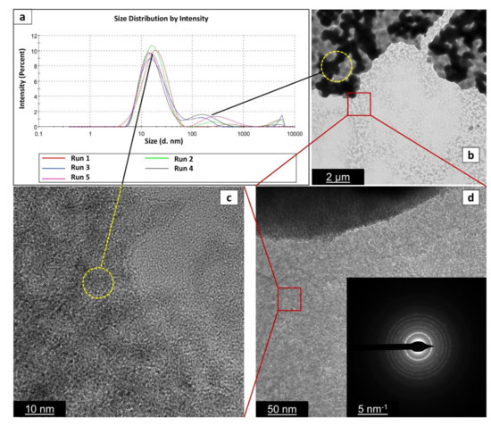 Particle size distribution via DLS analysis (a), TEM (b), and HRTEM (c,d) images of the sample TiO2_60_Powd. With black lines and yellow circles, we indicate that images in (b,c) can provide a visual representation of the two peaks observed in (a–c), and (d) images were taken in the same area of the sample progressively magnified (indicated by red squares). Inset in (d) gives the selected area electron diffraction (SAED) image of the red squared area in (d).