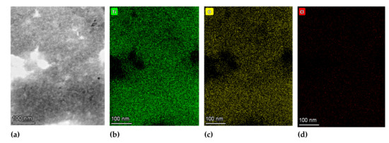 TEM bright-field image (a) and elemental distribution maps for Ti (b), O (c), and Cl (d) on an area of sample TiO2_60_Powd. Denser fractions of the sample appear as more intense colors.