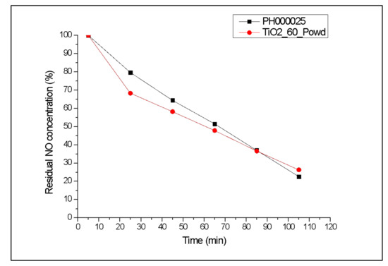 Once the possibility to reproduce suspension’s stability was confirmed, and mineralogic composition and morphology of the industrial product with the simple and fast MW synthesis were reported, the photocatalytic activity of the sample TiO2_60_Powd was examined in order to compare NO depletion efficiency of the sample with the one shown by the industrial product PH00025. Tests were carried out as reported in Section 2.5 [17,36]. Kinetic trends of residual NO concentration obtained during photocatalytic tests on samples PH000025 and TiO2_60_Powd are reported in Figure 7, and the percentage of NO depletion after 105 min is also reported in Table 5. The photocatalytic efficiency of TiO2_60_Powd after 105 min is comparable with the one shown by the industrial product. Moreover, TiO2_60_Powd shows a faster kinetic in the initial 25 min; then, the NO degradation rate slightly decreases, compared with the industrial product, to ultimately yield a slightly lower result with respect to PH000025. Above all, at the end of the considered time, the photocatalytic activity of the synthesized sample is comparable to the one shown by the industrial product, and this occurs even though the BET surface area of TiO2_60_Powd is slightly lower than the one of PH000025 (Table 5) [40,46,47].