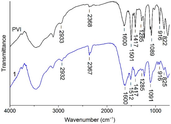 The FTIR spectra of the polymer contains absorption bands of stretching vibrations of the imidazole fragment: 2933 (C–H), 1501, 1600 (C=N), 1417 (C–N), 1285 (C–H) cm−1; CH groups of the azole ring: 1110 and 1089 cm−1; and bending vibrations of the heterocycle: 916, 822 cm−1 (Figure 1). The band between 3650 and 3300 cm−1 refers to the stretching vibration of physically bound water. The 1H NMR spectra of PVI contains an intense signal from the protons of the main polymer chain and the imidazole fragment: 1.92–2.34 ppm. (m, 2H, CH2), 2.95–3.14 ppm. (m, 1H, CH), 6.65–6.69 ppm. (m, 3H, imidazole ring). PVI is characterized by high resistance to thermal oxidative degradation since the thermal decomposition of the polymer begins above 380 °C.