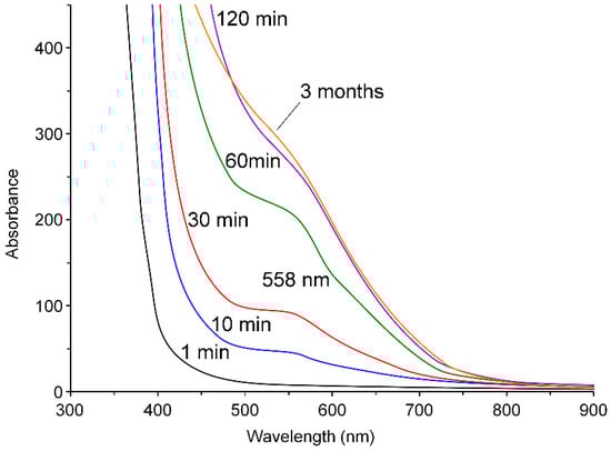 The formation of CuNPs was confirmed using surface plasmon resonance spectra in the UV–visible region. Figure 2 shows the optical absorption spectra of aqueous solutions of the reaction mixture, reflecting the kinetic features of the reaction process. The formation of copper nanoparticles begins after 10 min of the reaction, which is accompanied by the appearance of an absorption band with a maximum at 558 nm, which is characteristic of the plasmon absorption of zero-valent copper nanoparticles. With further stirring of the reaction mixture, the absorption intensity increases and the process of nanocomposite formation is practically completed in 120 min. The position of the plasmon absorption band (588 nm) in the UV spectrum of the synthesized nanocomposite confirms the formation of CuNPs metal nanoparticles. It has been reported in the literature that the surface plasmon resonance band of Cu, CuO and Cu2O nanoparticles provides absorption in the UV spectra range 570–600 nm [57], 200–350 nm [58,59,60,61] and 480–485 nm [62,63], respectively.