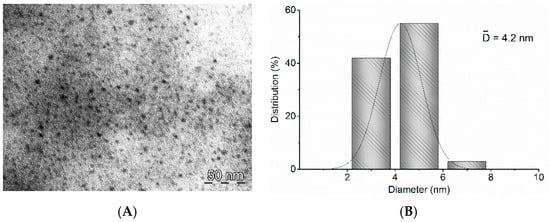 The use of the method of transmission electron microscopy made it possible to study the size and shape of the formed CuNPs, as well as the nature of their distribution in the PVI polymer matrix. As seen in Figure 3, CuNPs are fairly uniformly distributed in the matrix of the synthesized nanocomposite. Nanoparticles have a spherical shape and are characterized by sizes in the range of 2–8 nm. The predominant amount of nanoparticles (55%) has a size of 4–6 nm. The average nanoparticle diameter is 4.2 nm. Such a small size of nanoparticles and their low content (1.0%) contributed to the fact that the synthesized nanocomposite is readily soluble in water, which is important for the development of biomedical materials.