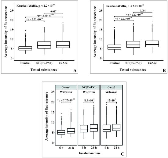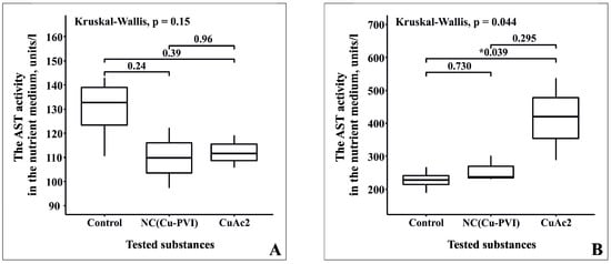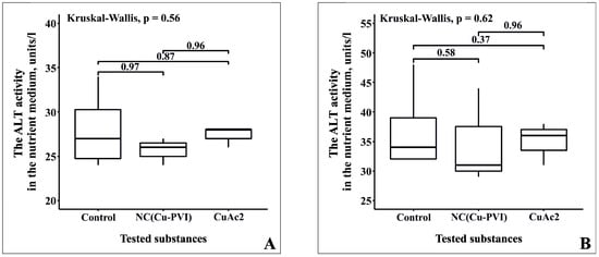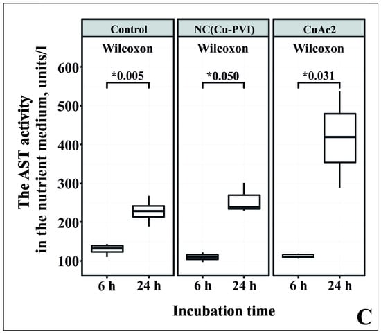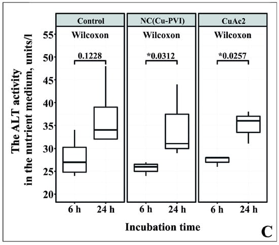Statistical analysis of the data showed that at the selected time points (6 h and 24 h), the ALT activity in the samples exposed to the NC(Cu-PVI) and CuAc2 did not significantly differ from the enzyme activity in the control specimens (Figure 6A,B). Nevertheless, during the experiment, after incubation with both analytes, a significant growth in ALT activity was observed (Figure 6C), and although in this case the activity increase level is comparable for the NC(Cu-PVI), for CuAc2, the median value for the latter substance was found to be somewhat higher (Figure 6A–C).