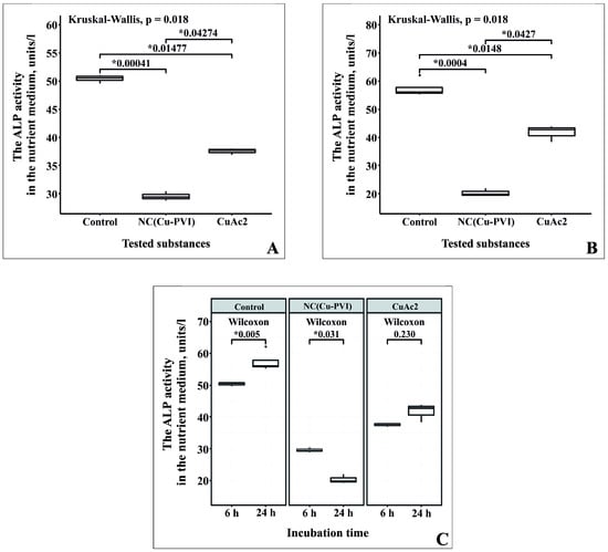 Change in ALP activity in the culture medium after 6 h (A) and 24 h (B) of incubation with the NC(Cu-PVI) or CuAc2 in comparison with the control group and depending on the duration of incubation (C). Medians and first and third quartiles are shown. * Differences are considered significant at p < 0.05.