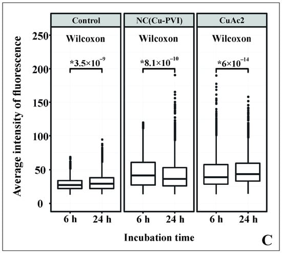 Changes in the cytochrome c oxidase fluorescent stain intensity in the hepatocyte culture after 6 h (A) and 24 h (B) of incubation with the NC(Cu-PVI) or CuAc2 in comparison with the control group and depending on the duration of incubation (C). Medians and first and third quartiles are shown. * Differences are considered significant at p < 0.05.