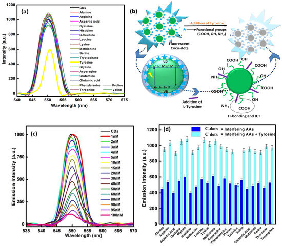 Twenty amino acids (aspartic acid, serine, alanine, glycine, leucine, isoleucine, proline, valine, phenylalanine, tyrosine, tryptophan, histidine, glutamic acid, cysteine, asparagine, glutamine, lysine, arginine, methionine, and threonine) were utilized to certify the selectivity of the prepared C-dots (Figure 7a). Fluorescence spectroscopy was applied to evaluate the emission behavior of respective system, as it is considered as one of the most uncomplicated, inexpensive, and frequently used techniques in terms of sensing performance. The maximum excitation and emission wavelengths for the developed C-dots were kept at 295 nm and 530 nm during analysis. Under the optimum conditions, out of 20 different amino acids, the respective C-dots were found to be highly selective towards tyrosine. In case of tyrosine, the quenching (turn-off) phenomena was observed, whereas in the case of other amino acids, the emission intensity profile did not change much, which confirms the ultimate selectivity pattern of the developed C-dots towards tyrosine. Tyrosine is a non-essential amino acid and is considered one of the foremost targets for radical attacks. Tyrosine has been used by cells to produce proteins and continue the level of nutritional balance in the human body. It is therefore highly significant that the prepared C-dots sensed this amino acid and thus they hold potential in relation to the pharmaceutical and biotechnological industries due to their biocompatible and non-toxic nature. The current sensing method also demonstrated the detection of tyrosine at very low levels, representing a simple and low-cost methodology. The interior structure and resistance of the prepared C-dots is considered to be a potential feature related to the selectivity of particular amino acids. L-tyrosine is considered a neutral species and it has both anionic and cationic residues, i.e., (COO−) and (NH3+), respectively. The most important feature of tyrosine amino acid is the presence of a phenolic group which possess extreme charge transfer characteristics with the developed C-dots. The hydroxyl group of the phenol moiety causes a major charge transfer process, which suggests the outstanding sensitivity of tyrosine towards C-dots. Therefore, stable ionic complex formation occurred on both sides and was quite high in L-tyrosine. The hydrogen bonding between the different functional groups present on the exterior surface of the C-dots also suggested an interaction with L-tyrosine. The close proximity of hydrogen binding can lead to a quenching effect on the fluorescence intensity of the C-dots (Figure 7b). The slight shift in the fluorescence peak position of the C-dots in the presence of L-tyrosine further suggested a binding interaction. Inter-hydrogen bonding led to a decrease in the π-π* and n-π* states, which caused quenching in the fluorescence intensity of the formed C-dots. This may be been related to the intermolecular charge transfer (ICT) scheme [48,49]. The present interaction further suppressed various mechanistic behaviors such intramolecular hydrogen bonding and non-radiative relaxation, along with rotation and vibration. Among the different functional groups, N has a very high tendency towards hydrogen bond acceptors due to the presence of a lone pair. Therefore, selective analysis of L-tyrosine was carried out using the prepared C-dots through H-bonding. To scrutinize the effect of different concentrations of L-tyrosine, titration studies were carried with a fluoro-metric scheme (Figure 7c). The concentration was varied from 100 nM to 1 nM. It was observed that upon decreasing the concentration of tyrosine, the emission intensity increases linearly and after reaching a concentration of 1 nM, the emission intensity of L-tyrosine matches the intensity of the C-dots. It can thus be inferred that 1 nM was the minimum detectable concentration of L-tyrosine with the prepared C-dots under optimum conditions at room temperature. The obtained results reflect the potential of the developed C-dots to indicate the presence of tyrosine in an extremely uncomplicated manner. Further individual experiments were performed with the amino acids to investigate their individual nature, to ensure the selectivity of the sensed amino acid (L-tyrosine) and this was mixed with other chosen amino acids in the presence of C-dots (Figure 7d).