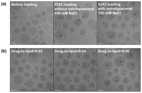 The physical state of an encapsulated drug inside liposomes is closely related to the trapping agent and can affect the drug’s retention and pharmacokinetics [49]. A sufficient payload must be stably encapsulated in liposomes for achieving a therapeutically effective dose. In this regard, the formation of an intraliposomal drug precipitate that keeps the drug gradient (lower concentration inside) during the loading and decouples from the acid-base equilibrium across the membrane is favorable [58]. In supporting that calcium acetate is a suitable trapping agent for precipitating the loaded IOX2 in the liposomes, rapid IOX2 precipitation was demonstrated after adding soluble IOX2 to a solution of 100 mM calcium acetate (pH 7.34), and the IOX2 solubility was found to be over 11-fold lower than that in the HEPES buffer (Figure S3). To see whether IOX2 can undergo intraliposomal nanoprecipitation by the Ca(OAc)2-mediated remote loading, IOX2-loaded liposomes were microscopically imaged by Cryo-EM. As shown in Figure 2, a single, electron-dense, and amorphous solid was found inside the most liposome interiors, together with the fact that the size of drug precipitates positively correlated to the amount of encapsulated IOX2 (Figure 2b and Figure S4), indicating the formation of Ca2+-IOX2 complexes. To our surprise, a large population of the liposomes had membrane structure changed from unilamellar to bilamellar, accompanied by drug deposits between two bilayers, after IOX2 loading with 10 mM HEPES (pH 7.4) plus 1 mM EDTA as the extraliposomal solution. Preforming a drug loading with a more isotonic HEPES-buffered saline (150 mM NaCl, 10 mM HEPES, and 1 mM EDTA, pH 7.4) was expected to circumvent this situation. As shown in Figure 2a, when using the isotonic HEPES-buffered saline, the unilamellar structure of the liposomes was preserved, while the size of intraliposomal drug precipitates remained unaffected.