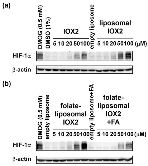 The abilities to stabilize the HIF-1α of liposomal IOX2 and free IOX2 were compared at the cellular level to evaluate if the liposome formulation could improve the drug efficacy. The folate-functionalized targeted IOX2-liposome was also evaluated to see if the drug efficacy could be boosted by the targeted delivery approach [65,66]. It is worth noting that the IOX2-liposomes can provide an apparent IOX2 concentration beyond its aqueous solubility limit (~2.5 mM at pH 7.4), highlighting another advantage of nanoformulation in pharmaceutical applications. The characterization results of the liposomes are summarized in Table S1. After the IOX2 loading, hydrodynamic diameters for the folate-free and 1% folate-decorated liposomes were ~110 nm and ~100 nm, respectively. The ζ-potentials of the folate-liposomes (~−3 mV) were slightly negative than those of folate-free liposomes (−1 mV to −2 mV), probably due to the negatively charged folates present on the liposome surface.