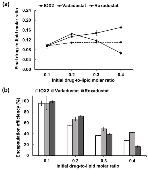 Given the shared pharmacophore features, we anticipated that the developed loading method also works for other heterocyclic glycinamide PHD2 inhibitors. Two clinically used PHD2 inhibitors—vadadustat and roxadustat, representing pyridine- and isoquinoline-based glycinamide derivatives, respectively (Figure S1), were also tested for the remote loading. The Ca(OAc)2-liposomes in the composition of DSPC/cholesterol/DSPE-PEG2000 (molar ratio: 45:50:5) were used for loading these drugs in an optimal extraliposomal solution at 65 °C for 30 min. While vadadustat and roxadustat also showed a ~100% loading at an initial drug-to-lipid molar ratio of 0.1, both drugs showed higher encapsulation efficiencies than IOX2 when using an initial drug-to-lipid molar ratio of 0.2 (Figure 5). For Vadadustat, a final drug-to-lipid molar ratio of ~0.17 was obtained when using an initial drug-to-lipid molar ratio of 0.4 (Figure 5a). For Roxadustat, the loading amount peaked at a drug-to-lipid molar ratio of 0.2, resulting in a final drug-to-lipid molar ratio of 0.15, which achieved the usual encapsulation ratio of commercial liposomal drugs. Due to the intrinsically low solubility of Roxadustat, using higher initial drug-to-lipid molar ratios (0.3 and 0.4) did not increase the loading amount and the encapsulation efficiency (Figure 5). Encapsulation at higher drug-to-lipid molar ratios could be further explored by using other complicated means to overcome solubility limitation [68].