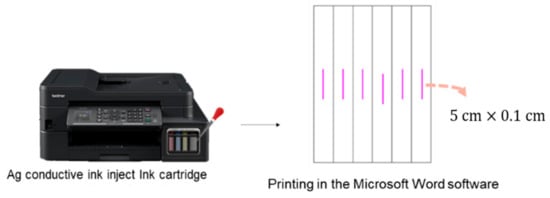 An ink cartridge for an MFC-T910DW printer (Brother International Corporation, Tokyo, Japan) was filled with the prepared Ag conductive ink. A printing conductive pattern test was designed using 5.0 × 0.1 cm2 rectangular samples for printing in the Microsoft Word software (Office 2016, Microsoft Corporation, Redmond, WA, USA), as shown in Figure 1. Pieces of inkjet PET paper were then placed in the printer, and repeat printing was carried out in accordance with the requirements of the experiment.